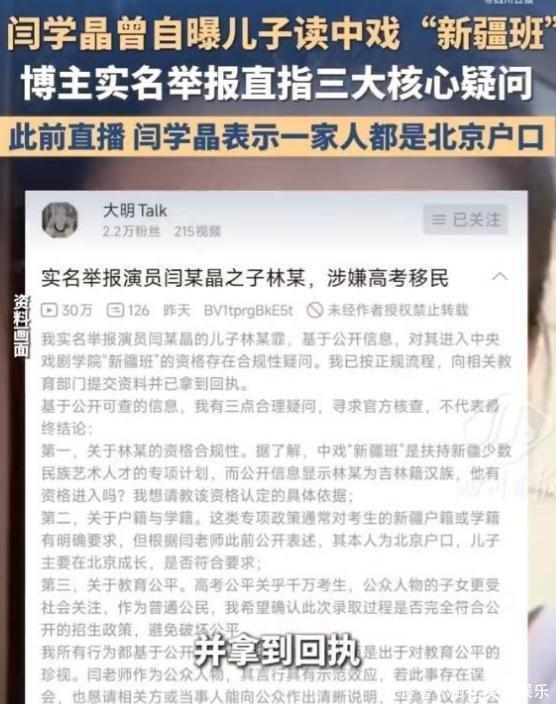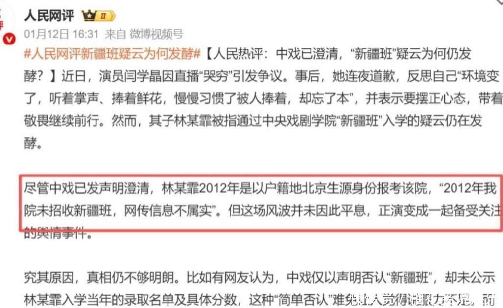 最要命的是她亲口说儿子高考分数低,靠中戏新疆班上的学。可问题是新疆班是给少数民族定向招的,林傲霏是北京户口汉族,按政策根本没资格。这话说出来等于自爆特权。